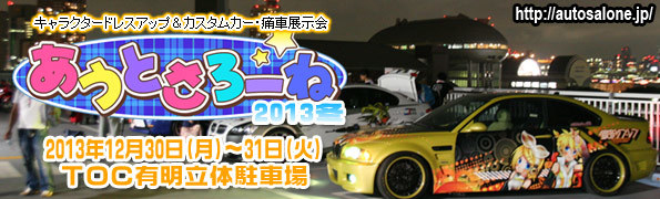 http://autosalone.jp/?p=140 〔開催日〕2013年12月30日(月)〜31日(火) 〔開催時間〕12:00〜イベント屋外終了時間まで(駐車は当日のみ可能) TOC有明駐車場7階 ■募集数 痛車(4輪) 30台+α 自転車、バイク(2輪)制限は特になし ※バイクは痛車の配置場所(屋上)とは異なり、エレベーターで移動して4F配置となります。痛車とは非常に離れている場所となりますので、予めご了承下さい。 ※2輪はメールでのみのエントリーとなります。希望日程とペンネーム・車種・仕様を記載してエントリー願います。 ■参加費(当日現