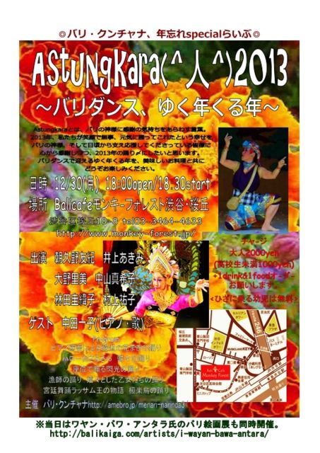 Astungkaraとは、バリの言葉で神様に感謝の気持ちを表わす言葉。 2013年、今年も世界はいろいろありましたが、私たちは笑顔で無事、元気に踊って来れた喜びと幸せを、バリの神様と、日頃から支え、応援してくださっているみなさまに感謝しつつ2013年を踊り〆したいと思います。 今回は年末ならではのspecialとして、ミュ−ジシャンの中田一子さんをゲストに迎え、2014年に向けて新たな試みとなる楽しいプログラムもお送りします。 バリの名作古典から最近の話題作、そして東京発・新しいバリの世界まで、 バリダンスで送るゆく年くる年を、美味しい
