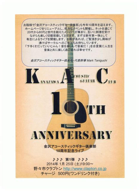 1月25日(土)PM7:00スタート あの、マーク谷口さん率いる 「金沢アコースティックギター倶楽部」 10周年記念LIVE ミュージックチャージ 500円(ワンドリンク付)