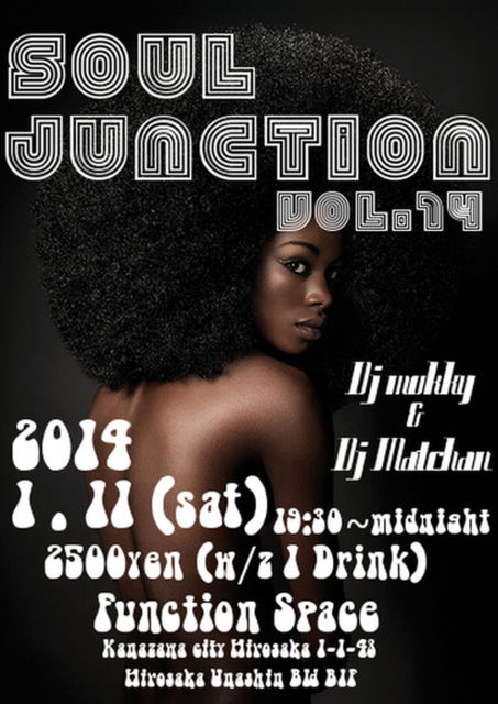----- SOUL JUNCTION Vol.14 ----- Soul Danceclassic Funk R&B HIPHOP Reggae House …etc All Black Music Dance Night !!! ■Date■ 2013 / 1 / 11 (Sat) Start 19:30 ~ ■Place■ Function space http://www.facebook.com/pages/Function-Space/398513430223837 石川県金沢市広坂1-1-48 広坂ウナシンビルB1F (1Fターバンカレーさんが目印です) ■Door■ \2500-( w/z 1 Drink Ticket ) ■Regular DJ's■ DJ.mokky (Soul Junction / Orbital Bar) http://iflyer.tv/ja/artist/24796 D