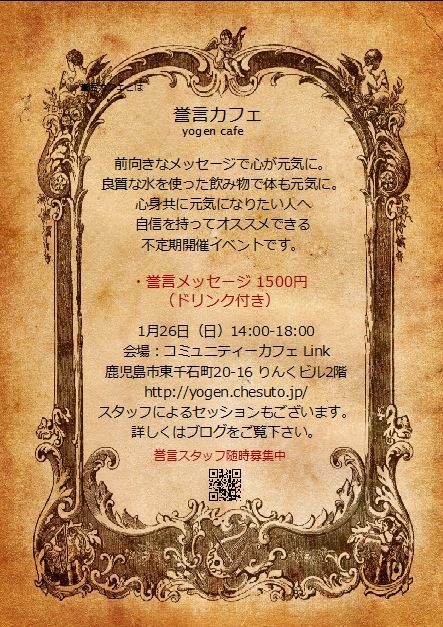 2014年新春の誉言カフェは1月26日(日)りんくカフェにて14時から18時まで開催します!今更ですが「誉言カフェ」ってどんなイベント?と思っている方もいらっしゃるでしょうから改めて説明を。 ここではその人の本質を直感的に受け取り、今必要なメッセージをお伝えするというものです。 「なんか怖いこと言われて、高い商品買わされるんじゃないの〜?」とか思ったあなた、ご安心下さい! 励ましやワクワクする事を主に伝えていますので、脅したりはしませんし、高い商品もありません。 体に優しい水でこだわりのお飲み物をお出