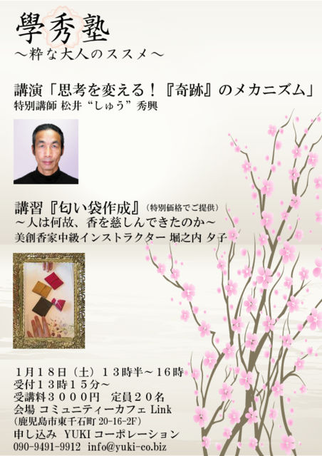 ワクワクするコラボが実現しました! 2014年が楽しい年になりますよう、ぜひご参加下さい!! ●講演「思考を変える!『奇跡』のメカニズム」 特別講師 松井“しゅう”秀興 ・・・なぜ奇跡は起きるのか?そのメカニズムを知り、自分に奇跡を起こす方法を教えます。 ●講習「匂い袋作成」(特別価格でご提供)※受講料に入っています 〜人は何故、香を慈しんできたのか〜 美創香家中級インストラクター堀之内夕子 ・・・今回の匂い袋作成は、予め、基本の調香に参加者それぞれが一番惹かれる香(今必要な香)を合わせて頂く内容になり