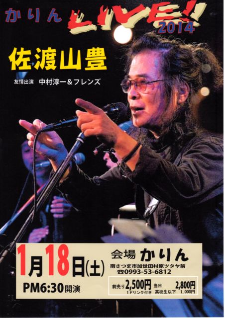 1月18日(土) 鹿児島 喫茶かりん http://www3.ocn.ne.jp/~kamiins/profile9.html 開演:18:30 料金:2500円(1ドリンク付き) 1月19日(日) 鹿児島 まいにちキャンプ 開場:19:30 開演:20:00 料金:2000円 お問い合わせ 090−5486−2641 1月21日(火) 熊本 尚廉 http://www.showren.jp/ 詳細未定 1月24日(金) 長崎 フォーク酒場1970 開演:20:00 投げ銭 1月25日(土) 長崎 田園 http://nagasakidenen.cocolog-nifty.com/blog/ もしくは http://loco.yahoo.co.jp/place/086bc63a84059e357511