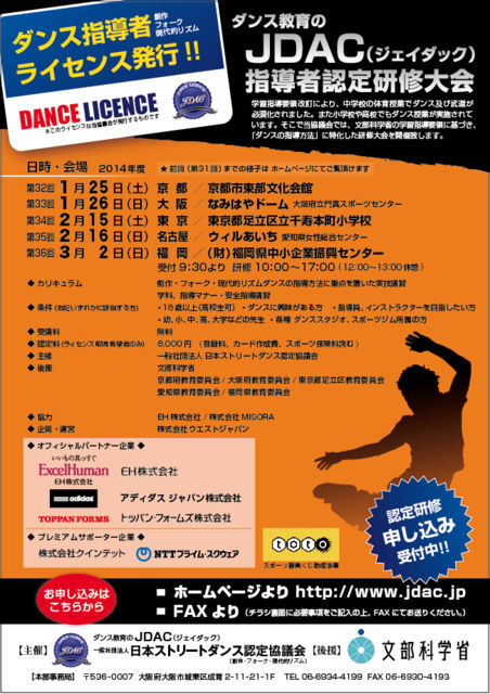 ¡Ú¥À¥ó¥¹»ØÆ³¼Ô¤Î¤¿¤á¤Î¸¦½¤Âç²ñ³«ºÅ¡ª¡Û £Ê£Ä£Á£Ã ÆüËÜ¥¹¥È¥ê¡¼¥È¥À¥ó¥¹Ç§Ä궨µÄ²ñ¤¬¼çºÅ¤¹¤ë¡¢Ê¸Éô²Ê³Ø¾Ê¸å±ç¤Î¥À¥ó¥¹»ØÆ³¼Ô¸þ¤±¤Î¸¦½¤Âç²ñ¤¬¹Ô¤ï¤ì¤Þ¤¹¡£ £±·î£²£µÆü¡ÊÅڡ˵þÅÔ¡¡µþÅÔÅìÉôʸ²½²ñ´Û £±·î£²£¶Æü¡ÊÆü¡ËÂçºå¡¡¤Ê¤ß¤Ï¤ä¥É¡¼¥à ¼õ¹ÖÎÁ¡§ÌµÎÁ ¥é¥¤¥»¥ó¥¹Ç§ÄêÎÁ¡§£¸¡¤£°£°£°±ß¡Ê´õ˾¼Ô¤Î¤ß¡Ë ¢¨½éµé¤Î¥é¥¤¥»¥ó¥¹¤Ë¤Ê¤ê¤Þ¤¹¡£¤³¤Î¾åµé»ñ³Ê¤Ç¤¢¤ë¡Ö¥À¥ó¥¹¶µ°é»ØÆ³»Î¡×¤¬º£ÂçÊÑÃíÌܤµ¤ì¤Æ¤¤¤Þ¤¹¡ª ³Ø¹»¶µ°é¤Ë¼è¤êÆþ¤ì¤é¤ì¤¿£³¤Ä¤Î¥À¥ó¥¹¡ÊÁϺ¥Õ¥©¡¼¥¯¡¢¸½ÂåŪ¥ê¥º¥à¡Ë¤Î»ØÆ³ÊýË¡¤Ë½ÅÅÀ¤òÃÖ¤¤¤¿¸¦½¤¤Ç¡¢³Ø²Ê¤ä»ØÆ³¥Þ¥Ê¡¼¡¢°ÂÁ´