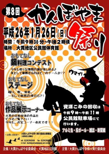 2014年1月26日開催 ☆おもてなし鍋料理コンテスト (各チームの鍋料理が無料で配られます♪是非食べ比べをして投票お願いいたします♪) ☆おもてなしステージ発表 ☆おもてなし作品展示 その他、出店多数♪ 年明け一発目の大貫ならではのイベント!是非お誘い合わせの上ご来場ください♪
