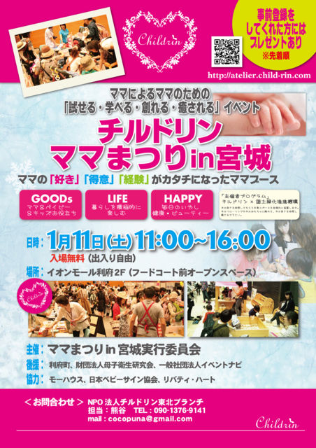 宮城で開催されるママのためのママによるイベント ママまつりin宮城開催!! 日時:1月11日(土) AM11:00〜PM4:00 入場無料!出入り自由! 場所:イオンモール利府2F (フードコート前オープンスペース) で開催されます 。 ママまつりとは・・・ ママによるママのための文化祭。運営もボランティアのママが行っています。 ママとお子様が一緒に楽しめる場所として開催いたします。 ママが笑顔になれば子供も笑顔に みんなが笑顔に ママまつりの詳細はコチラ↓ http://www.child-rin.com/activity/even