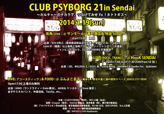 3ヵ所で開催します! 《街角Live》 @サンモール一番町商店街 特設Stage start13:00 無料 出演:SCK GIRLS(産地直送気仙沼少女隊)、安部ひとみ、Fragrance、Love it!(福島)以上各地ご当地アイドル レン+ジャンボー(大道芸)、ジャンピングクロウ、CLUB PSYBORG打楽器部 《LIVE(ROCK、TRANCE)》 @HooK Open17:00 start17:30 2000Yen(1D別) 出演:OD、BULDOG-Z、SOUL丼、Little Wing、DasKe-Yo&SHOWGO、Qubizme 他etc. 《LIVE(アコースティック)、FOOD》 @ぶんよこまる(美味しい東北の食と酒の提供スペ