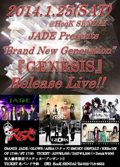 “JADE Presents” 出演 ・JADE ・Smoky Gestalt ・HERe:NE ・スタッズ ・Glory age Metropolis ・ASRA OPEN 17:00 / START 17:30 ADV ¥2000 / DAY ¥2500 (DRINK代別途) ※ASRAは19:40頃〜の予定です。 チケット予約をご希望の方は、お名前・日付・会場名・枚数を明記の上、HP[http://asra.tirirenge.com/]のMAIL(CONTACT)よりお送りください! 皆さまのご来場心よりお待ちしております(*´∀`)ノ
