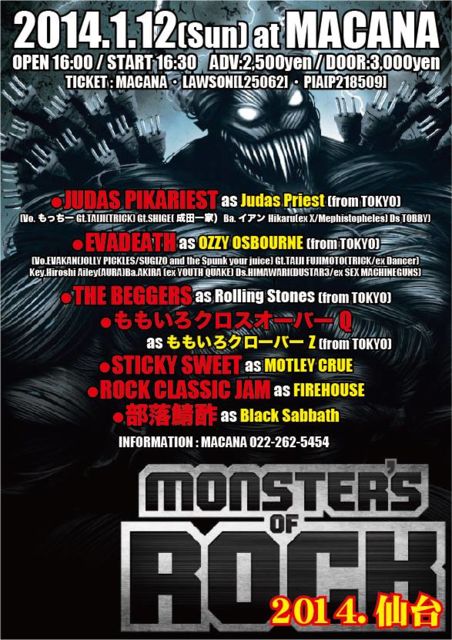 1月12日(日)にMACANAにて MONSTER’S OF ROCK 2014.仙台 開催します!! 往年の名曲が聴けます。 ゲストも豪華ですよ!! 是非、遊びに来て下さい。 2014.1.12(Sun) at SENDAI MACANA open 16:00 / start 16:30 ¥2500(¥3000) MACANA店頭 ローソンチケット(L-25062) チケットぴあ(P-218509) 出 演 ●JUDAS PIKARIEST as Judas Priest(from 東京)● Vo.もっちー / Gt.TAIJI(TRICK/ex Dancer) / Gt.SHIGE(成田一家) Ba.イアンHikaru(ex X/Mephistopheles) / Ds TOBBY ●EVADEATH as OZZY OSBOURNE(from 東京)● Vo.EVAKAN(JOLLY