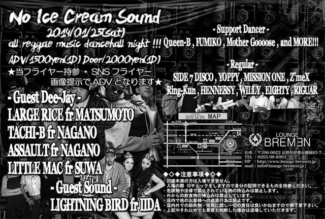´ÉÍý¿ÍÍÍ¡¢¹ðÃμºÎ餤¤¿¤·¤Þ¤¹¡£ ¤È¤Ã¤¯¤ËÌÀ¤±¤Þ¤·¤¿2014ޥޥޥº£Ç¯¤âÃϸµ°ËÆá»Ô¤Ç³§¤µ¤ó¤È¶¦¤ËޥޥޥREGGAE MUSIC¤Ç¿ì¤¤¤·¤ì¤Ê¤¬¤é1ǯ´Ö³Ú¤·¤ó¤Ç¹Ô¤¤¿¤¤¤È»×¤Ã¤Æ¤ª¤ê¤Þ¤¹¡£ 1·î25Æü¡ÚNoIceCreamSound¡Û@BREMEN³«ºÅ¤Ç¤´¤¶¤¤¤Þ¤¹¡ª ¿·Ç¯²ñµ¤Ê¬¤Çޥޥޥ¶¯Îõ¤Ê´¨ÇÈ¡¢Î䤨¹þ¤ß¤ÎÃæ¤Çޥޥޥ1·î25Æü¤Ï¿®½£TOP REGGAE¿Ø¤È¶¦¤ËDANCEHALL¤Ç²¹¤Þ¤ê¤Þ¤·¤ç¤¦¡ª¡ª ¡ú¡ù¡ú¡¡No Ice Cream Sound¡¡¡ú¡ù¡ú 2014 START!!!!! ¡Ú¾ì½ê¡Û °ËÆá»Ô¡¡¡÷LOUNGE BREMEN ¡ÚÆü»þ¡Û 2014ǯ1·î25Æü(ÅÚ)¡¡21¡§00¥¹¥¿¡¼¥È ¡ÚÆþ¾ì¡Û ADV:¡ï1500(1D) DOOR:¡ï2000(1D