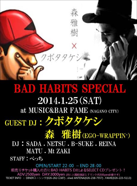 ¹ðÃΤª¤Í¤¬¤¤¤·¤Þ¤¹¡£ £±·î£²£µÆüÅÚÍËÆü¤ËBAD HABITS¤Î¥¹¥Ú¥·¥ã¥ë¤ò³«ºÅ¤¤¤¿¤·¤Þ¤¹¡ª ¥²¥¹¥ÈDJ¤Ï¥¯¥Ü¥¿¥¿¥±¥·¤µ¤ó¤È¥¨¥´¥é¥Ã¥Ô¥ó¤Î¿¹¤µ¤ó¤Ç¤¹¡ª ¤ß¤ó¤Ê¤ÇÁû¤¤¤ÇÆÝ¤ó¤Ç¤¿¤Î¤·¤ß¤Þ¤·¤ç¤¦¡ª¡ª¡ª ¤ªÂÔ¤Á¤·¤Æ¤ª¤ê¤Þ¡¼¤¹¡ª ... BAD HABITS SPECIAL 2014.1/25(SAT) at MUSIC&BAR FAME (NAGANO CITY) SPECIAL GUEST DJ: ¥¯¥Ü¥¿¥¿¥±¥· ¿¹¡¡²í¼ù¡ÊEGO-WRAPPIN'¡Ë DJ:SADA.NETSU.B-SUKE.REINA.MATU.Mt ZAKI STAFF:¤Ù¤Ã¤Á OPEN/START 22:00 END 28¡§00 Á°Çä¤ê¥Á¥±¥Ã¥È¹ØÆþ¤ÎÊý¤ËBAD HABITS DJ¤Ë¤è¤ëSELECT CD¥×¥ì¥¼¥ó¥È¡ª ADV: