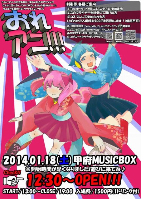 ¥¢¥²¤Þ¤·¤Æ¡¢¤ª¤á¤Ç¤È¤¦¡ú¡ú ¹â¤Þ¤ê¤Ï¤¸¤á¤Ï¤ª¤ì¥¢¥Ë¤Ç¡ª »³Íü¤Î¤ªÁû¤®·Ï¥¹¥¿¥ó¥À¡¼¥É¡¦¥¢¥Ë¥½¥ó¥¤¥Ù¥ó¥È¡Ö¤ª¤ì¥¢¥Ë!!¡×¤¬ Â繥ɾ¤Ë¤Æ¤Þ¤¿¤Þ¤¿³«ºÅ¡ª¡ª Â裳²ó¤ò·Þ¤¨¡¢Ç®¶¸¤Ï¤µ¤é¤Ë¥Ñ¥ï¡¼¥¢¥Ã¥×¡ª¡ª ¡ý³«»Ï»þ´Ö¤òµ¢¤ê¥é¥¯¥é¥¯13»þ¤ËÊѹ¹¡ª ¡ýÂ繥ɾ¤ÎDJ MEI¡õDai3110¤µ¤ó¤¬ºÆÅо졪¡ª ¤µ¤é¤Ê¤ë¿Ê²½¤ò¤È¤²¤¿¡Ö¤ª¤ì¥¢¥Ë¡×¤ò¸«Æ¨¤¹¤Ê¡ª¡ª ----------------------------------------------------------- Æü»þ¡§2014ǯ1·î18Æü¡ÊÅÚÍË¡Ë ³«¾ì¡§12:30¡Á ³«»Ï¡§13:00¡Á19:00 >>¢¨³«ºÅ»þ´Ö¤¬Áá¤Þ¤ê¤Þ¤·¤¿!!¡Ë<< ¾ì½ê¡§¹ÃÉÜMUSIC BOX