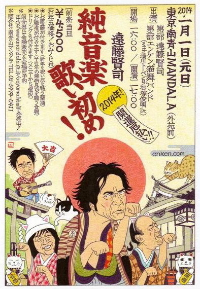 管理人様 告知失礼します。 明けて元日は2014年初ライブ! 『開運厄祓い純音楽歌い始め!』 16時開場 17時開始 前売り/当日 ¥4500 お屠蘇 お雑煮 ドリンク付 エンケンバンドで新年をむかえましょう。新たな年をワッショイでお祝い。 開運、厄払い、金運、恋愛運何でも御戯れの大吉ライブ。 みなさま、いらっしゃいませ!!! ◎年の初めは「南青山マンダラ」で、 お屠蘇を飲んで、お雑煮食べて、エンケン ワッショイ! http://enken.com/info.html