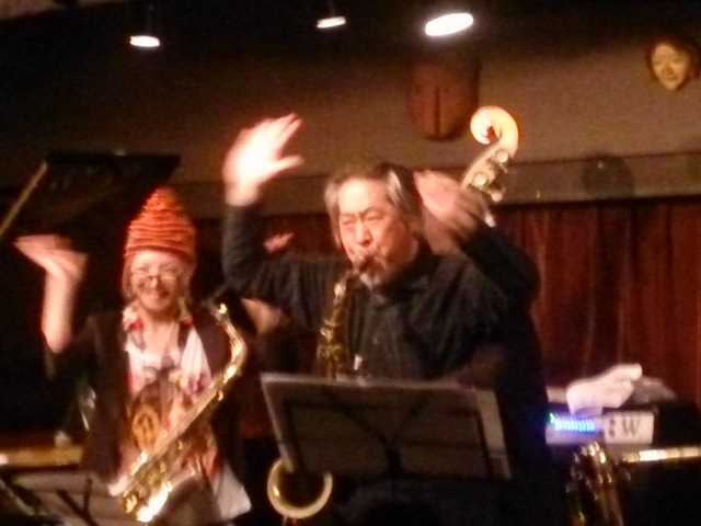 1月1日(水)新宿・新宿PITINN【板橋文夫グループ】 出演: 片山広明(T.sax) 板橋文夫(P) 纐纈雅代(As) 吉田隆一(Bs) 類家心平(Tp) 太田惠資(Vn) 瀬尾高志(B) 外山明(Ds) ↓PITINNのHP http://www.pit-inn.com/ ★毎年恒例お正月のオールナイトライブのトリです。 出番は夜中の3時半です。 片山さんの演奏はとてもいいですよー! 写真は今年最後のライブ、ドルフィーの様子です。おめでたい二人羽織。 皆様、よいお年を。 来年も片山さんをよろしくお願いいたします。