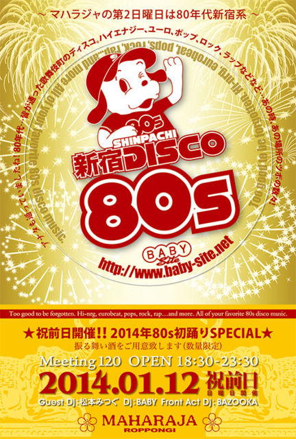 『SHINPACHI新宿DISCO80s』 ★祝前日開催!!2014年80s初踊りSPECIAL★ 振る舞い酒をご用意致します(数量限定) ノリは勿論80年代新宿系(^^)v 1/12(日・祝前日)18時半より六本木マハラジャに大集合! ▼ディスカウントゲスト登録24時間受付中▼ ディスカウント料金でご入場出来る、ゲスト登録を24時間受付中です。 メール送信で、 1.開催日、2.お名前(フリガナ)、3.人数 をお伝え下さい。 初めての方も、お一人様からグループまで、どなたもお早めにどうぞ! (※mixiまたはFacebookからのメールでも受け付けます) ◆