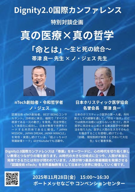 私たちDignity2.0国際カンファレンスは、世界が抱える7つの課題(気候・戦争・孤独・脳疲労・AI時代の尊厳危機・格差・文明の方向性喪失)に対し、医療・教育・経済・文化・AI・環境・芸術など様々なジャンルが、“いまを生きる人たちに必要なイノベーション” を探求する場 として年に1回開催しています。 5周年目となる今年のテーマは、「BEST BEINGが拓く心の時代」をテーマに展示・発表・対話・体験・交流の5つを軸にした多彩なプログラムを用意しています。 その中で、今回、日本ホリスティック医学の第一人者・帯津良一先生をお招きし対談