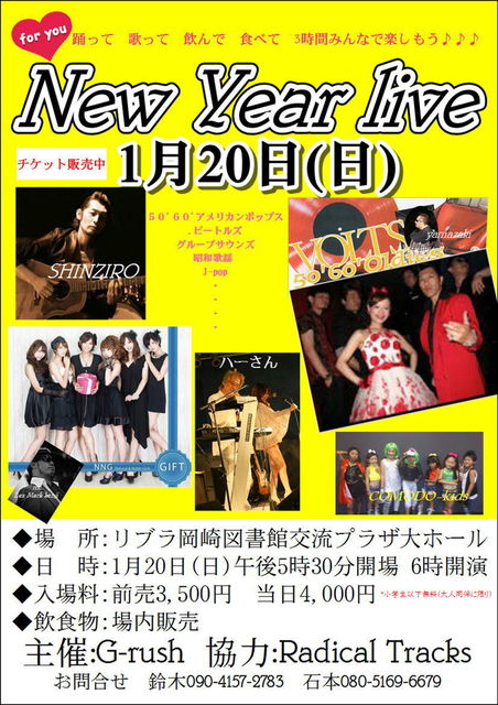 □■□主催: G-rush ジ-・ラッシュ□■□ ♪♪♪老若男女みんなで 踊って 歌って 飲んで 食べて 3時間♪♪♪ ◆場所:リブラ岡崎図書館交流プラザ大ホール ◆開場:pm5:00 ◆入場料 前売3500円 当日4000円 *予約は前売り扱い *大人同伴の場合は小学生以下無料 ◆飲食物:場内販売 ◆出演者 NNG は〜さんバンド VILTS SHINZIRO COMODO-KIDS ◆楽曲 J-POP GS 昭和歌謡 50'60'アメリカンポツプス ビートルズ キャロル・・・・ どなたでも参加できます。 お問い合わせ 鈴木090-4157-2783 へどうぞ