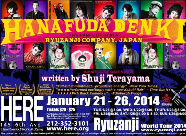 日本国内の神社やお寺、歌舞伎小屋をまわり、海外ではインドネシア、英国エジンバラ、NY、カナダで喝采を浴びた流山児★事務所の『花札伝綺』が再度NYに上陸です! 1月21日から26日まで。時代の閉塞感を軽やかに乗り越える言葉の魔術師、詩人寺山修司の初期戯曲。生と死が転倒する日本発のピッチ・ブラック・ミュージカル。 心の鎖を解きに劇場に遊びに来てください。異界への誘いには気をつけて・・・。英語字幕付き日本語上演。 詳細はこちらまで↓ http://www.here.org/about/directions-ticket-info/ http://music.geocit