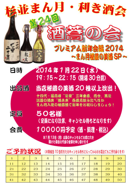 Â裲£´²óÌܤμò¶¾¤Î²ñ¤Ï¡¢¿·Ç¯ºÇ½é¤Î¼ò¶¾¤Î²ñ¡Ø¥×¥ì¥ß¥¢¥à¿·Ç¯²ñÊÔ2014¡Ù¤Ç¤¹¡ª ÉáÃʤª½Ð¤·¤Ç¤¤Ê¤¤¡¢¤Þ¤ó·îÈ뢤ÎÈþ¼ò¤ò£²£°¼ï°Ê¾å¤´´®Ç½Äº¤¡¢¿·Ç¯¤ò¤ª½Ë¤¤¤·¤Þ¤·¤ç¤¦¡ª ¢¨Â¢¸µ¤µ¤ó¤Ï¥²¥¹¥È»²²ÃÃפ·¤Þ¤»¤ó¡£ mixi¤Ç¤Ï¡¢²¼µÃí°Õ»ö¹à¤ò¤´³Îǧ¤Î¤¦¤¨¡¢¤´Í½Ì󲼤µ¤¤¤Þ¤»¡£ ¡ú¤´Í½Ìó¼õÉÕ³«»ÏÆü¡ú £¹·î£¹Æü¡Ê·î¡Ë¤è¤ê¡¢¤´ÍèŹ¤´°û¿©¤µ¤ì¤¿¤ªµÒÍͤòÍ¥À褷¤Æ¤´Í½Ìó¼õÉÕÃפ·¤Þ¤¹¡£ ¤ªÅÅÏá¢mixi¤«¤é¤Ï¡¢ ³«ºÅÆü10ÆüÁ°¡Ê1¡¿12¡Á¡Ë¤â¤·¤¯¤Ï¥¥ã¥ó¥»¥ëÂÔ¤Á¾õÂ֤ˤʤä¿Æü¤«¤é¼õÉÕ¤µ¤»¤ÆÄº¤¤Þ¤¹¡£ ¡ú½ÐÉʼò¡Ê£²£°¼ï°Ê¾å¡Ë¡ú