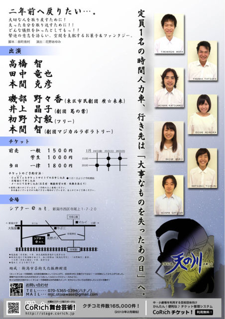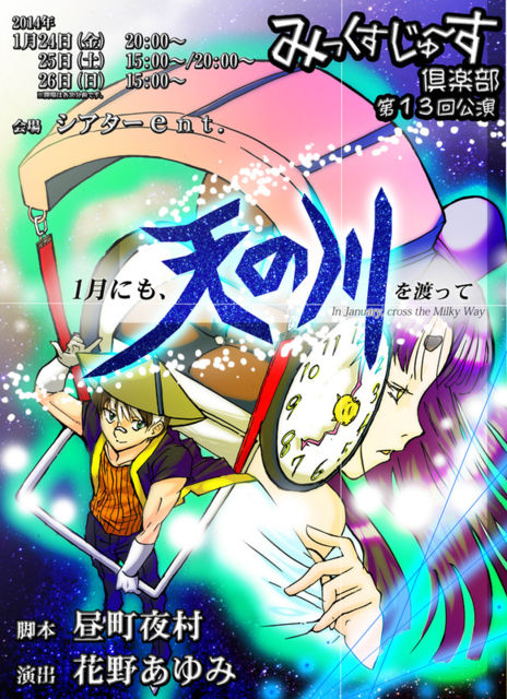 みっくすじゅ〜す倶楽部 第13回公演 「 1月にも、天の川を渡って 」 脚本 : 昼町夜村 演出 : 花野あゆみ 2014年 1月 24日 (金) 20:00〜 25日 (土) 15:00〜 / 20:00〜 26日 (日) 15:00〜 会場 : シアターent. (新潟市西区寺尾上1−7−20) 前売 : 一般1500円 / 学生1000円 当日 : 一律1800円 二年前へ戻りたい…。 大切な人を取り戻すために! 失った自分を取り返すために!! どんな犠牲を払ったとしても…!!! 緊迫の意志を語らい、空間を支配するお菓子&ファンタジー。