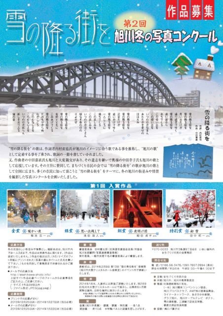 ギャラリー陽【ひかり】in mixi ★★★ 「雪の降る街を」第2回 旭川冬の写真コンクール ★★★ 年も明けて2014年になりました! みなさま!今年もよろしくお願い致します(*^^*) さて!北の赤DXさんのご提案企画! 「雪の降る街を」第2回 旭川冬の写真コンクール! 応募条件は旭川市内の冬の写真となっています。 メールでもプリントでも応募できるので参加しやすい企画だと思います(^^) 参加人数を確認したいとの事でしたので参加される方は、 通常のイベントと変わらず、このイベントのページで参加をポチッっとお願いします。
