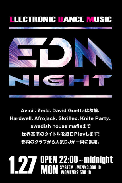 五十嵐ゲストのキャメロットと言えば男性2000円1D、女性1500円1Dです! 1/27(Mon) 22:00~ 【EDM NIGHT】 @CLUB camelot 世界基準のタイトルを終日PLAY!! 都内のCLUBから人気DJ集結!! −−−−−−−−−− ◆DJ ANDO DJ tAisuke 五十嵐恭雄 takato TOMMY Yu-ji ERiiii KAZUYUK! Ayato −−−−−−−−−− ◆ゲスト料金 M 2,000/1d W 1,500/1d −−−−−−−−−− ▼CLUB camelot▼ 〒150-0041 東京都渋谷区神南1-18-2 神南坂フレームB2/B3 03-5728-5613 http://www.clubcamelot.jp/ ▼ご注意/NOTICE