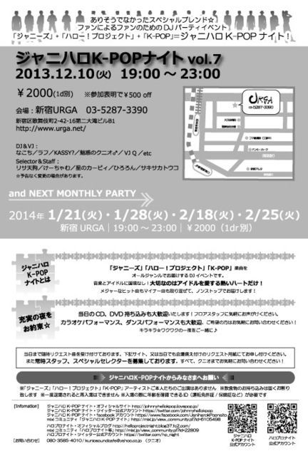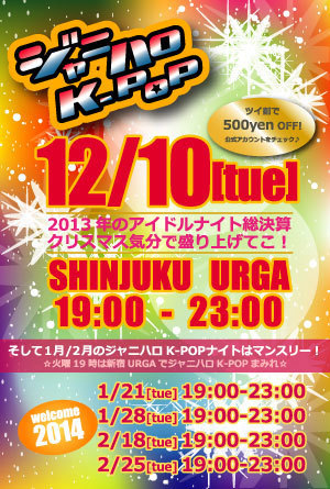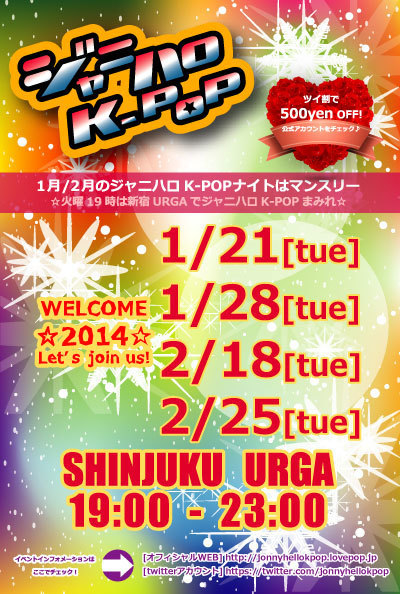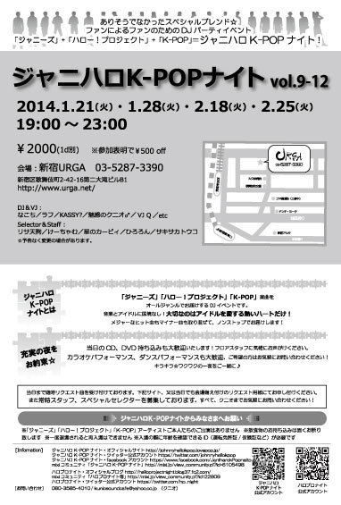 2014ǯ¤ÏÆó¼ïϢ³¤Ç¥¹¥¿¡¼¥È¡ª º£¤Þ¤Ç¤¢¤ê¤½¤¦¤Ç¤Ê¤«¤Ã¤¿¡¢ Ã˽÷¥¢¥¤¥É¥ë³Ú¶Ê¥¹¥Ú¥·¥ã¥ë¥Ñ¡¼¥Æ¥£¡¼¤òÀ§Èó¤È¤â¤´´®Ç½¤¯¤À¤µ¤¤¡£ ¡È¥¸¥ã¥Ë¥Ï¥íK-POP¥Ê¥¤¥È¡É Æü»þ¡§2014ǯ1·î28Æü(²Ð)19:00¡Á23:00¡ª ²ñ¾ì¡§¿·½ÉURGA¡¡03-5287-3390 ½»½ê¡§¿·½É¶è²ÎÉñ´ìÄ®2-42-16ÂèÆóÂçÂì¥Ó¥ëB1 http://www.urga.net/ ÅöÆüÎÁ¶â¡§¡ï2000(1dÊÌ)¡¡»²²ÃɽÌÀ³ä¡§¡ï1500(1dÊÌ) ¢¨¤³¤Á¤é¤Ë½ñ¤¹þ¤ß¤Ç¡ï500¥ª¥Õ¤È¤Ê¤ê¤Þ¤¹¡£ DJ¡õVJ¡§¤Ê¤³¤Á¡¿ ¥é¥Õ¡¿KASSY?¡¿Ì¥ÏǤΥ¯¥Ë¥ª¡é VJ¡§£Ñ - Selector¡õStaff - ¥ê¥µÅ·¶é¡¿ ¤±¡¼¤Á¤ã¤à¡¿À±¤Î¥«¡¼¥Ó¥£¡¿¤Ò¤í