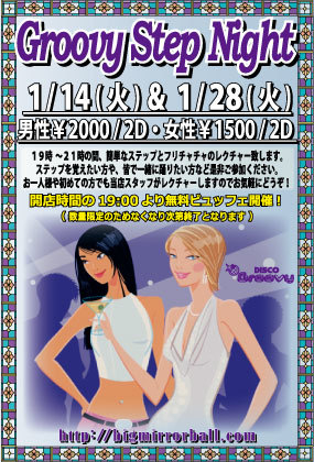 ¡Ú2014ǯ¤â¡¢Â裲¡¦Â裴¤Î²ÐÍËÆü¤ÏDISCO Groovy¤Î STEP NIGHT¡ª 19»þ¡Á21»þ¤Î´Ö¡¢´Êñ¤Ê¥¹¥Æ¥Ã¥×¤È¥Õ¥ê¥Á¥ã¥Á¥ã¤Î¥ì¥¯¥Á¥ã¡¼¤¢¤ê¤Þ¤¹¡ª¡Û ¡Ú½é¿´¼Ô¤ÎÊý¡¢¤ª°ì¿ÍÍͤǤ⡢ÅöŹ¥¹¥¿¥Ã¥Õ¤¬¤´Âбþ¤µ¤»¤ÆÄº¤¤Þ¤¹¤Î¤Ç¡¢¤É¤¦¤¾¤ªµ¤·Ú¤Ë¤´»²²Ã¤¯¤À¤µ¤¤(^_-)-¡ù¡Û ¡Ú²»³Ú¡Û ALL MIX ¡Ê21»þ¤«¤é¤ÏÄ̾ï¤ÎDISCO TIME¤Ë¤Ê¤ê¤Þ¤¹¡£¥ê¥¯¥¨¥¹¥È¤Ë¤â½ÐÍè¤ë¸Â¤ê¤ª±þ¤¨¤¤¤¿¤·¤Þ¤¹¤Î¤ÇDJ¤Þ¤Ç¤É¤¦¤¾¢ö¡Ë ¡Ú³«ºÅ»þ´Ö¡Û 19:00¡Á24:00 ¡ÚÎÁ¶â¡Û ÃËÀ¡§¡ï2,000/2Drinks¡Ü¥Ó¥å¥Ã¥Õ¥§ ½÷À¡§¡ï1,500/2Drinks¡Ü¥Ó¥å¥Ã¥Õ¥§ ¡Ê¥Ó¥å¥Ã¥Õ¥§¤Ï19»þ¤è¤ê¤´ÍѰÕÃפ·¤Þ