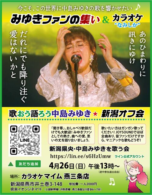 中島みゆきと 『同じ時代に生まれてうれしい』 そんな思いの方ならどなたでも! □時:4月26日(日)午後13時〜17時(19時頃まで延長可・途中入退出自由) □所:カラオケマイム燕三条店 燕市井土巻3-148イオンシネマ・ワーナーマイカル1F(飲食物の持ち込みは不可です) □参加費:1人 2000円 歌うもよし、歌わないでおしゃべり歓談だけもよし。ファン歴の長短にかかわらず、みゆきソングへの思いや、コンサート夜会などの思い出話に花を咲かせましょう! ※参加ご希望の方は下記ライン公式「友だち追加」でお願いいたします。 ライン