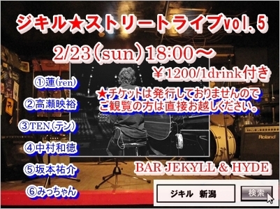 ¡ú2·î23Æü¡ÊÆü¡Ë18»þ¡Á ¼çºÅ¡§²ñ¾ì/JEKYLL&HYDE http://www17.ocn.ne.jp/~jekyll/ ¢£¥¸¥¥ë¥¹¥È¥ê¡¼¥È¥é¥¤¥ÖVOL,5¢£ ¡ü18:00¡Á/\1200/1drinkÉÕ¤ ¥Á¥±¥Ã¥È¤Ïȯ¹Ô¤·¤Æ¤ª¤ê¤Þ¤»¤ó¤Î¤ÇľÀܤª±Û¤·¤¯¤À¤µ¤¤¤Þ¤»¢ö ¡Ï¡(ren) ¢¹âÀ¥±Ç͵ £TEN¡Ê¥Æ¥ó¡Ë ¤ÃæÂ¼ÏÂÆÁ ¥ºäËÜÍ´²ð ¡Ê޽ŽÍŽß޼ެŽÙŽ»ŽÝޏ޽/¶¯ÎÏ¥µ¥«¥â¥È¡Ë ¦¤ß¤Ã¤Á¤ã¤ó