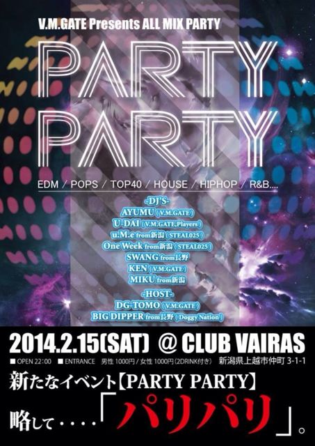 ¿·¤¿¤Ê¥¤¥Ù¥ó¥È¡ÖPARTY PARTY¡×ά¤·¤Æ¡Ö¥Ñ¥ê¥Ñ¥ê¡×¡ª¡ª¡ª ï¤â¤¬ÃΤäƤ¤¤ë¤¢¤Î¶Ê¤¬¤«¤«¤ë¡ª¡ª ï¤Ç¤â³Ú¤·¤á¤ë¡ª¡ª ¤ª¼ò¤¬¿Ê¤à¡ª¡ª º£¤Þ¤Ç¤Î¾å±Û¤Ë¤Ï̵¤«¤Ã¤¿¿·¤¿¤ÊGroove¤¬Âδ¶½ÐÍè¤ë Ķ ALL MIX PARTY¡ª¡ª¡ª 2·î15Æü¤Ï¾å±ÛCLUB VAIRAS¡ÚPARTY PARTY¡Û¤Ë¤ªÇ¤¤»²¼¤µ¤¤¡ª¡ª 2014.2.15 (SAT) V.M.GATE Presents ALL MIX PARTY ¡ÚPARTY PARTY ¡Á¥Ñ¥ê¥Ñ¥ê¡Á¡Û EDM,POPS,TOP40,HOUSE,HIPHOP,R&B... ¢£@CLUB VAIRAS (¾å±Û»ÔÃçÄ®3-1-1) ¢£OPEN 22:00 ¢£ENTRANCE ÃËÀ 1000±ß ½÷À 1000±ß 2¥É¥ê¥ó¥¯ÉÕ ¡ÚDJ¡Çs¡Û A