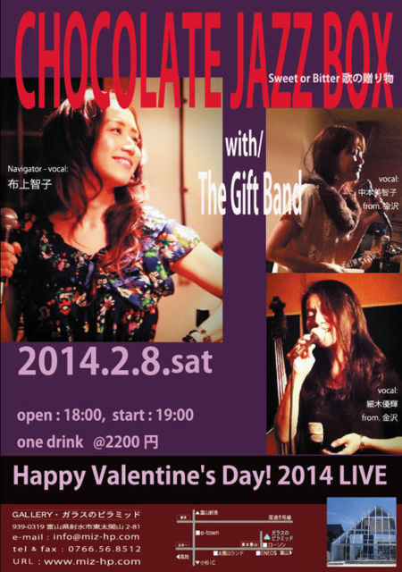 2/8ÅÚ Chocolate Jazz Box http://www.grava.jp/tomo/schedule/2014/02/#a000392 2/8ÅÚ ³«¾ì18:00 ³«±é19:00 ÉÙ»³¸©¼Í¿å»ÔÅìÂÀ¹Þ»³£²ÃúÌÜ£¸£± ¥¬¥é¥¹¤Î¥Ô¥é¥ß¥Ã¥É 0766-56-8512 http://space08.exblog.jp/21878498/ ¡ÖCHOCOLATE JAZZ BOX with / The Gift Band ¥Ð¥ì¥ó¥¿¥¤¥óLIVE! ¡× ÉÛ¾åÃÒ»ÒVo,ºÙÌÚÍ¥µ±Vo,ÃæËÜÈþÃÒ»ÒVo,Ê¡°æÄ¾½¨Fl,ÎÓ¿¿¿®G,Â¼ÃæÀé¾½Pf,Ãæ»³¤È¤âB,Ãæ°æÏÂÌéDr £²£°£°£°±ß¡Ê£±¥É¥ê¥ó¥¯ÉÕ¤¡Ë