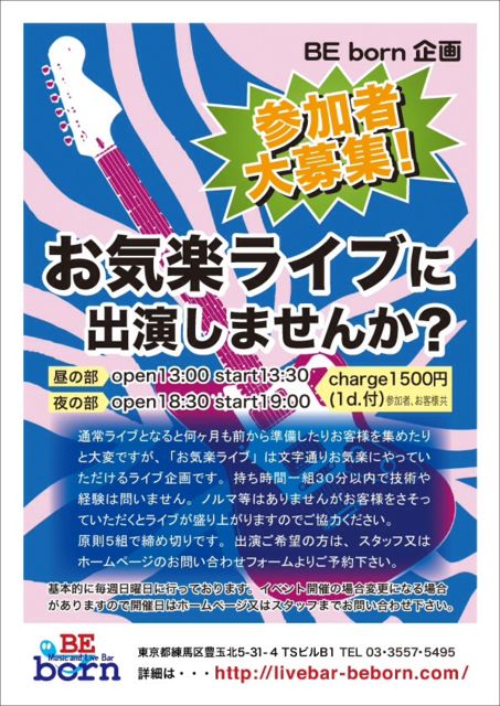 ¤ªµ¤³Ú¥é¥¤¥Ö ÎýÇÏBE born¤Ç¤Ï¡¢¤ªµ¤³Ú¥é¥¤¥Ö¤ò³«ºÅ¤¤¤¿¤·¤Þ¤¹¡£ ¤ªµ¤³Ú¥é¥¤¥Ö¤È¤Ï¡¢½Ð±é¼Ô¤Î¤ß¤Ê¤µ¤Þ¤É¤¦¤·¤Æ¡¢¤ª¸ß¤¤¤Î¥Ð¥ó¥É¤òÀ¹¤ê¾å¤²¤Ê¤¬¤é¡¢¥×¥í¡¢¥¢¥ÞÌä¤ï¤º³Ú¤·¤¯¥é¥¤¥Ö¤ò¤·¤Þ¤·¤ç¤¦¤È¤¤¤¦´ë²è¤Ç¤¹¡£ Ãë¤ÎÉô13:00¥ª¡¼¥×¥ó¡Ê½Ð±é¼Ô½¸¹ç»þ´Ö¡Ë 13:30¥¹¥¿¡¼¥È Ìë¤ÎÉô18:30¥ª¡¼¥×¥ó¡Ê½Ð±é¼Ô½¸¹ç»þ´Ö¡Ë 19:00¥¹¥¿¡¼¥È ¥ê¥Ï¡¼¥µ¥ë¤Ï¤¢¤ê¤Þ¤»¤ó¤¬¡¢»Ï¤Þ¤ëÁ°¤Ë¥µ¥¦¥ó¥É¥Á¥§¥Ã¥¯¤ò¤·¤Æ¡¢½àÈ÷¤¬¤Ç¤¤·¤À¤¤¥¹¥¿¡¼¥È¤È¤Ê¤ê¤Þ¤¹¡£ ½Ð±é¼Ô¡¢¤ªµÒÍͤȤ⡢¤ª°ì¿ÍÍÍ¡¢£±£µ£°£°±ß¡Ê£±drÉÕ¤¡Ë¡¢±éÁÕ»þ´Ö£³£°Ê¬¤Ç¤¹¡£ ¥Î¥ë¥ÞÅù