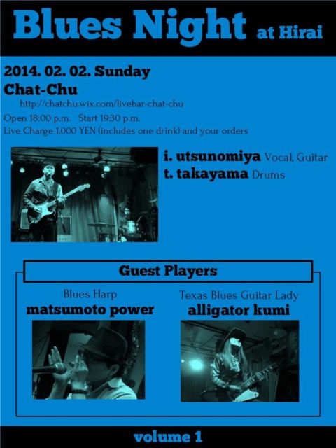 2·î2Æü¤ÏBlues Night¢ö ÃϸµÊ¿°æ¤òµòÅÀ¤È¤·¤Æ³èÌöÃæ¤Î°Û¿§¥Ç¥å¥ª¤¬Åо졪 Chat-chu¤ò¥·¥«¥´¤ÎÌë¤Ë¤·¤Þ¤¹^^ ¡ü±§ÅԵܰìμ(Vo. & Gt.)¡õ¹â»³Å¯ºÈ(Drs.)...and more... 18:00¡¡OPEN 19:30¡¡START ¡ù¥Á¥ã¡¼¥¸\1,000(1DrinkÉÕ) 21:30¡ÁÄ̾ï±Ä¶È ¡ú¥Ð¥ó¥É¤´¾Ò²ð¡ú ±§ÅԵܰìμ(Vo. & Gt.)¡õ¹â»³Å¯ºÈ(Drs.)¤Î¥Ç¥å¥ª¡£ ¥®¥¿¡¼¥Ü¡¼¥«¥ë¤È¥É¥é¥à¤Î¤ß¤È¤¤¤¦¥æ¥Ë¡¼¥¯¤ÊÊÔÀ®¤Ç¡¢¥·¥«¥´¥Ö¥ë¡¼¥¹¤òÃæ¿´¤ËÆÈ¼«¤Î¥¢¥ì¥ó¥¸¤Ç¤ªÆÏ¤±¤·¤Æ¤¤¤Þ¤¹¡£ ÅöÆü¤Ï¥²¥¹¥È¥®¥¿¥ê¥¹¥È¡¢¥²¥¹¥È¥Ï¡¼¥Ô¥¹¥È¤Ê¤É¤â»²²Ã¤·¤ÆÆø¤ä¤«¤ËÀ¹¤ê¾å¤²¤¿¤¤¤È»×¤Ã¤Æ¤¤¤Þ¤¹¡£ ¤É¤¦
