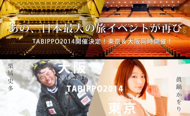 《さぁ、人生を変える旅に出よう。》 http://tabippo2014.com/ 日本最大級の旅イベント「TABIPPO2014」開催決定! タレントの眞鍋かをりさん、脳科学者の茂木健一郎さん、登山家の栗城史多さんなど 豪華ゲスト続々出演決定中! あなたの夢への一歩、踏み出してみませんか? 世界一周団体TABIPPO