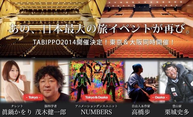 《さぁ、人生を変える旅に出よう。》 http://tabippo2014.com/ 日本最大級の旅イベント「TABIPPO2014」開催決定! タレントの眞鍋かをりさん、脳科学者の茂木健一郎さん、登山家の栗城史多さんなど 豪華ゲスト続々出演決定中! あなたの夢への一歩、踏み出してみませんか? 世界一周団体TABIPPO