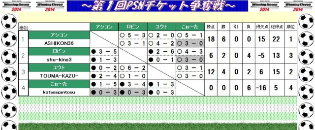 大会規定や進行方法をよく理解して頂き、 必ず最新版のデータパックをアップデートした状態で 大会に臨んでください。 試合はフリーロビーで行なってください。 なおこの大会の優勝者は、ラウールからPSネットワーク3千円分商品として進呈します。 大会期間は決まってますが、相手と都合合わせて自由な時間で 試合を進めていけますので、普段時間の都合がつかずに大会 に参加できない人も含めて、常連の皆様も是非参加ください。 参加希望者は「イベントに参加する」を選択し、ウイイレID(PS3ID)を書き込んで下さい。 IDの記載がな