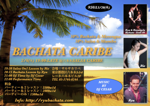 ¡úBACHATA CARIBE¡ú Ï»ËÜÌڤο͵¤¥Ð¡¼¥µ¥ë¥µ¥«¥ê¥Ù¤Ç¥Ð¥Á¥ã¡¼¥¿¥Ê¥¤¥È¤ò³Ú¤·¤â¤¦¡¢¤â¤Á¤í¤ó¥µ¥ë¥µ¡¢¥Þ¥ó¥Ü¤ä¥á¥ì¥ó¥²¤â¤¿¤Ã¤×¤ê¤«¤«¤ê¤Þ¤¹¡ª¥Ð¥Á¥ã¡¼¥¿Â¿¤á¤Î¤¤¤Ä¤â¤ÎDJ CESAR¤Î¥×¥ì¥¤¤Ë¤Ê¤ê¤Þ¤¹¡£ Bachata & Merengue¡Ê50%¡ËSalsa & Mambo¡Ê50%¡Ë¤Î³ä¹ç¤Ë¤Ê¤ê¤Þ¤¹¡£ ÅöÆü¤Ï¥ì¥®¥å¡¼¥é¥¤¥ó¥¹¥È¥é¥¯¥¿¡¼Rie¤Î¥µ¥ë¥µOn1¥ì¥Ã¥¹¥ó¥×¥é¥¹¥²¥¹¥È¥¤¥ó¥¹¥È¥é¥¯¥¿¡¼Ryu¤Î¥Ð¥Á¥ã¡¼¥¿¥ì¥Ã¥¹¥ó¼õ¤±¤é¤ì¤Þ¤¹¡ªº£²ó¤ÏRie¤È¥Ð¥Á¥ã¡¼¥¿¤Ç¤â¡¢Caciques¥µ¥ë¥µO2¥Ñ¥Õ¥©¡¢¤½¤·¤ÆRosangela¥Ð¥Á¥ã¡¼¥¿¡õ¥º¡¼¥¯¥Ñ¥Õ¥©¤ä¤ê¤Þ¤¹¡£³§¤µ¤óÀ§ÈóÍ·¤Ó¤ËÍè¤Æ²¼¤µ¤¤¡ª ¢¡Æü