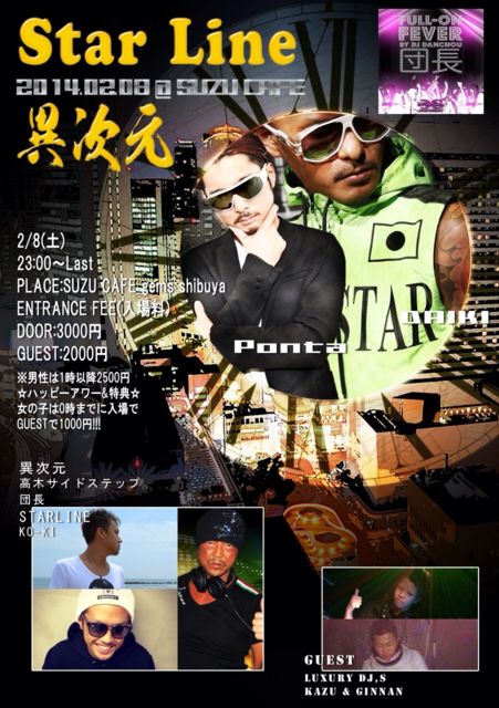 2/8(土)GEMS渋谷 異次元×STAR LINE (渋谷新南口 駅前) 23:00〜Last 受付で団長のゲストと 言って頂くかiPhoneの方は Full-On Fever DJ-DANCHOU ダウンロード画面の提示で ディスカウントになります http://mixi.jp/view_bbs.pl?comm_id=656684&id=75415978 ENTRANCE FEE(入場料) DOOR:3000円 GUEST:2000円 ハッピーアワー&特典 女の子は0時までに入場で GUESTで1000円 ※男性は1時以降2500円 かなた&DJ S-mileのバースデー ■Guest DJ,s KAZU(Luxury) GINNA-N(Luxury