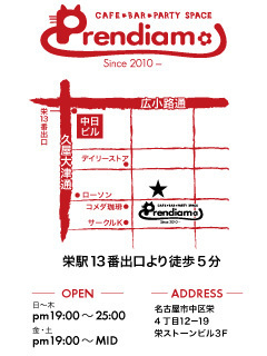 管理人様、貴重なスペース失礼します 栄のBARで半立食パーティー みんなで盛り上がりましょう 【日時】 2月8日(土) 18時45分 受付開始 19時00分 スタート 21時00分 終了 【場所】 Prendiamo(プレンディアモ) 中区栄4−12−20 栄ストーンビル3A 0522656286 http://r.tabelog.com/aichi/A2301/A230103/23039118/ 現地集合でお願いします☆ 【料金】 男性4,000円 女性2,000円 女性と参加された方は二人共500円割引となります。 女性二人参加→二人共1,500円 【コース内容】 料理4種