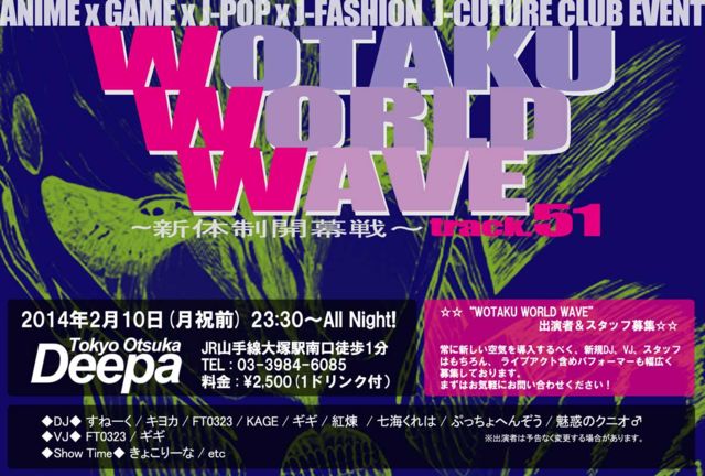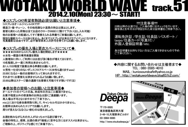 2014年もよろしくお願い致します! “WOTAKU WORLD WAVE Track.51” 〜新体制開幕戦〜 日時:2014年2月10日(月祝前)23:30〜All Night! 会場:大塚Deepa 住所:東京都豊島区南大塚3-49-10大塚鈴本ビルB1 TEL:03-3984-6085 http://www.otsukadeepa.jp/ ---------------------------------------------- 当日:¥2500(1Drink Ticket付き) ---------------------------------------- ------ ◆DJ◆ すねーく / キヨカ / FT0323 / KAGE / ギギ / 紅煉 / 七海くれは / ぷっちょへんぞう / 魅惑のクニオ♂ ※出演者は予告なく変