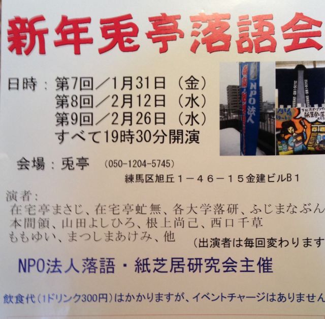 2014年2月12日水曜日19時30分から「第8回兎亭落語会」をレンタルスペースカフェ「兎亭」(練馬区旭丘1−46−15金建ビルB1、西武池袋線江古田駅下車徒歩5分)で開催します。 NPO法人落語・紙芝居研究会主催。 http://mixi.jp/view_community.pl?id=5818920 http://raku-kami.com (公式ホームページ) 入場無料。 落語、紙芝居、漫才、コントなどお笑い系出演者募集中。 飲食代(1ドリンク300円)はかかりますが、イベントチャージは無料です。 毎回ではありませんが、青山学院大学、東洋大学、成城大学の落語