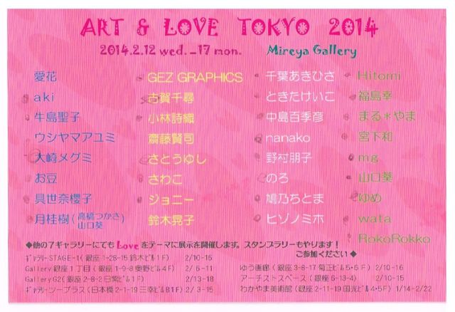 ART & LOVE TOKYO 2014 展 http://photo.mixi.jp/view_album.pl?album_id=500000089006700&owner_id=6660735 2月12日(水)〜17日(月) (イラスト・立体・絵画 展) 愛花 aki 牛島聖子 ウシヤマアユミ 大崎メグミ お豆 具世奈櫻子 月桂樹 GEZ GRAPHICS 古賀千尋 小林詩織 齋藤賢司 さとうゆし さわこ ジョニー 鈴木晃子 千葉あきひさ ときたけいこ 中島百季彦 nanako 野村朋子 のろ 鳩乃ちとま ヒゾノミホ Hitomi 福島幸 まる*やま 宮下和 mg ゆめ 山口葵 RokoRokko wata 33名のアー