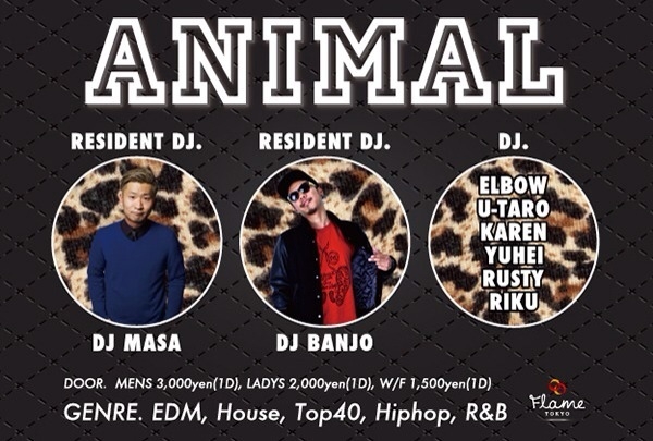グローバルな大人の遊び場『FLAME TOKYO』 EDM、HOUSE、TOP40 を中心に今を湧かす最新MIX、都内屈指の照明、音響空間。 これからの渋谷は『FLAME TOKYO』なくしては語れない。 そんな『FLAME TOKYO』にて 毎週水曜日のブランニューパーティー”ANIMAL” Resident DJ MASA, DJ BANJOを筆頭に, 現在のクラブシーンで活躍している若手DJ陣を中心にして送る 誰でも遊べるポップ×フレキシブルな水曜レギュラーパーティー。 EDM, House, Top40他、Hiphop, R & B等のBlack Musicも盛り込んだ 幅広いニーズに応えるALL MIX STYLE