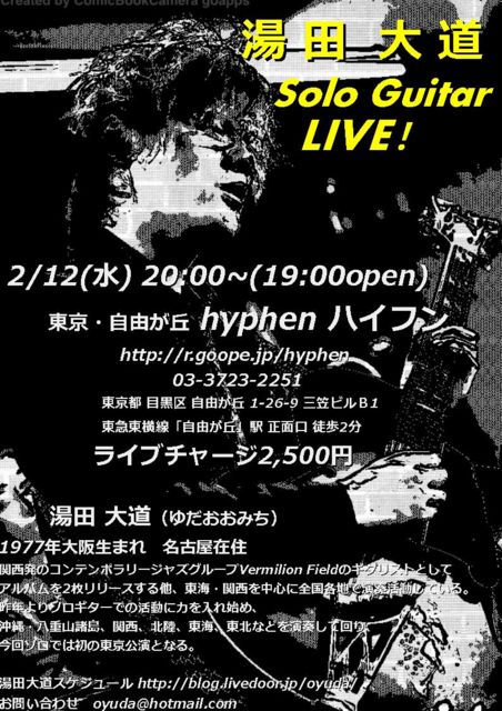 2/12(水)20:00〜 東京・自由が丘 hyphenハイフン http://r.goope.jp/hyphen 03-3723-2251 東京都 目黒区 自由が丘 1-26-9 三笠ビルB1 東急東横線「自由が丘」駅 正面口 徒歩2分 湯田大道solo!! チャージ2500円 大阪、京都、奈良、福井、名古屋、沖縄、宮城etc... 昨年ソロで色んな所を回ってきましたが、 はじめて東京でもソロライブをやります! これは定例イベントにしていきたいと思います♪ ぜひ、ぜひ!お越しください! ご予約をおすすめいたします♪ お店に直接でもかまいませんし、 僕にコメント、
