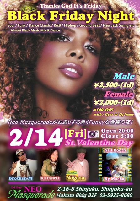 ____________ 2/14(Fri) Valentine 黒 金 Night Information ______________ いつもご来店ありがとぅございます☆ 先回1/10のBlack Fridayは、2014年幕開けといぅことでDj KIYOMI, Dj DORA, Dj Brother-Mの3人でお送り致しました^^b さて、2014年2月の第2週金曜もSoul、R&B〜HIPHOPまで多様な選曲でお楽しみ頂けますョ!この夜もまた いろんなBlack MusicがPlayされるでしょう☆ 今回は久々に横浜からDj NAGATA兄が参戦して頂きます♪ どんなValentine Nightになるのか... 黒金の醍醐味・・・聴く
