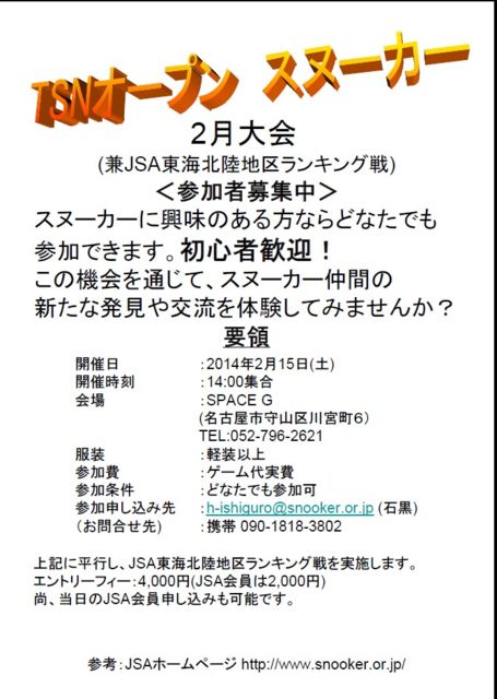 ¤ß¤Ê¤µ¤Þ¤Î»²²Ã¤ªÂÔ¤Á¤·¤Æ¤ª¤ê¤Þ¤¹¡£ ³«ºÅÆü¡§ 2·î15Æü¡ÊÅÚ¡Ë ²ñ¾ì¡§ SPACE G (°¦Ãθ©Ì¾¸Å²°»Ô¼é»³¶èÀîµÜÄ®£¶¡Ë ¡¡¡¡¡¡ TEL:052-796-2621 ½¸¹ç¡§ £±£´»þ£°£°Ê¬ ÉþÁõ¡§ ·ÚÁõ°Ê¾å »²²ÃÈñ¡§¥²¡¼¥àÂå¼ÂÈñ »²²Ã¿½¤·¹þ¤ßÀè¡§ ¡¡¡¡1) ¤³¤Î¥È¥Ô¥Ã¥¯¤Ë»²²ÃɽÌÀ ¡¡¡¡2) Àйõ(¥á¡¼¥ë) h-ishiguro@snooker.or.jp JSA¥¤¥Ù¥ó¥È¤ÏÃ϶è¥é¥ó¥¥ó¥°Àï¡£¥¨¥ó¥È¥ê¡¼¥Õ¥£¡¼¡ï4000±ß(JSA²ñ°÷¤Ï\2000±ß) ⤷¡¢JSA»²²Ã´õ˾¼Ô£´¿Í̤Ëþ¤Î¾ì¹ç¤ÏÉÔÀ®Î©¡£ TSN¥¤¥Ù¥ó¥È¤Ï¤¤¤Ä¤â¤É¤ª¤ê¤ÎÍ×ÎΤdz«ºÅ¤·¤Þ¤¹¡£ ¼çºÅ¡¡JSAÅ쳤¡¢TSN -------------