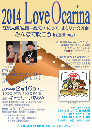 ¡ÚLove Ocarina¡Û¥ª¥«¥ê¥Ê¥³¥ó¥µ¡¼¥È¡õ¸òή²ñ £²£°£±£´Ç¯£²·î£±£¶Æü¡ÊÆü¡Ë¤Ë ¹¾ÇÈÂÀϺ¤µ¤ó¡¢º´Æ£°ìÈþ¤µ¤ó¤È¡¢ ¥ª¥«¥ê¥Ê¥¢¥ó¥µ¥ó¥Ö¥ë¡Ø¤Ô¤¯¤Ë¤Ã¤¯¡Ù¤Ç ¥ª¥«¥ê¥Ê¸òή²ñ¤ò¤¹¤ë¤³¤È¤Ë¤Ê¤ê¤Þ¤·¤¿¡£ ³§¤µ¤ó°ì½ï¤Ë¥ª¥«¥ê¥Ê¤ò¿á¤­¤Þ¤·¤ç¤¦¡ª¡ª ±éÁÕ»²²Ã¼Ô¤âÊç½¸Ãæ¤Ç¤¹¡£ ¼ÁÌä¤Ê¤É¤¢¤ì¤Ð¡¢kuma3¤Þ¤Ç¡¢¤´Ï¢Íí¤¯¤À¤µ¤¤¡Á Æü»þ¡¡£²·î£±£¶Æü¡ÊÆü¡Ë¡¡£±£²¡§£³£°³«¾ì¡¡£±£³¡§£°£°³«±é ¾ì½ê¡¡¥®¥ã¥é¥ê¡¼¤¤¤º¤ß¤ä¡¡ ¡¡¡¡¡¡ºë¶Ì¸©Ï¡ÅÄ»ÔÅ죵¡Ý£¹¡Ý£¸¡¡¤¤¤º¤ß¤ä¥Ó¥ë£³F ¡¡¡¡¡¡JRÅìËÌÀþ¡¡Ï¡Åıء¡ÅÌÊ⣱ʬ ¡¡¡¡¡¡»²²ÃÈñ£³£°£°£°±ß ¿½¹þ