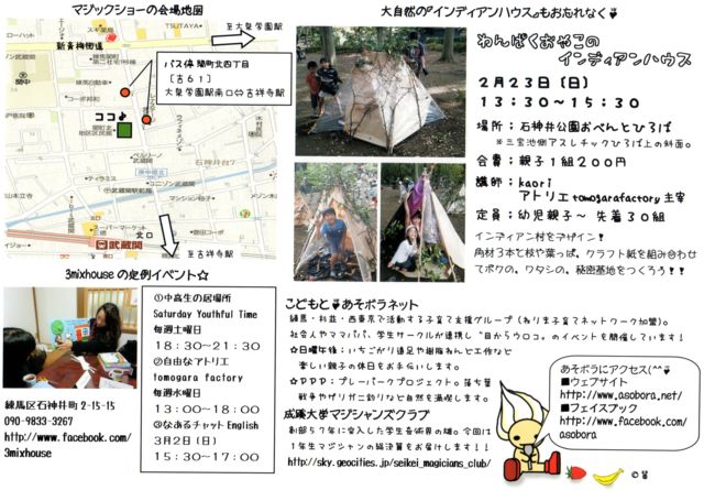 日祝日の親子の居場所。 あそボラの日曜午後シリーズは目からウロコの企画満載で月1回開催中。 http://www.asobora.net/ 日曜午後シリーズ/ ■顔の見える関係 あそボラは練馬区の西側を中心に活動しています。 で・す・が、 隣接する杉並区や西東京市、武蔵野市も広い意味でひとつのコミュニティと言えます! チャリ友圏=ママたちが自転車で行って友達になれるエリア。 このチャリ友圏を顔の見えるつながりでいっぱいにすることがあそボラの夢なんですね!! ■大学生のパワー
