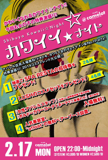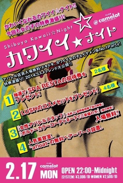 2014/02/17(Mon) 22:00~ 【カワイイ☆ナイト NEW YEAR SP】 @CLUB camelot −−−−−−−−−− 特別ディスカウント希望の方は、エントランスにて 「ユウタのゲストでミク」と言って頂ければ、 ◆Discount Guest M 2,000/1d W 1,500/1d でのご入場が可能です。 −−−−−−−−−− カワイイ女の子&イケメン率No1 Party"カワイイ☆ナイト" 今回も女性に特典満載!! ・抽選でSPA RESTAの招待券をプレゼント!(2名) ・LUSHのコスメセットをプレゼント!(4名) ・女性アパレルスタッフは入場無料!(名刺or証明書持